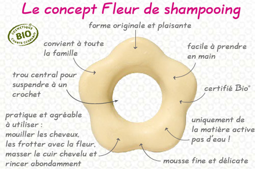 Concernant la forme du shampooing, c'est à dire celle de fleur, effectivement c'est joli. Le trou au milieu peut être pratique pour l'accrocher et faciliter son séchage. Mais au moment de l'utiliser, je dois à plusieurs reprises mouiller le savon et accentuer les frottements sur mon cuir chevelu afin de faire apparaître la mousse. J'ai un peu de mal à manier le savon.